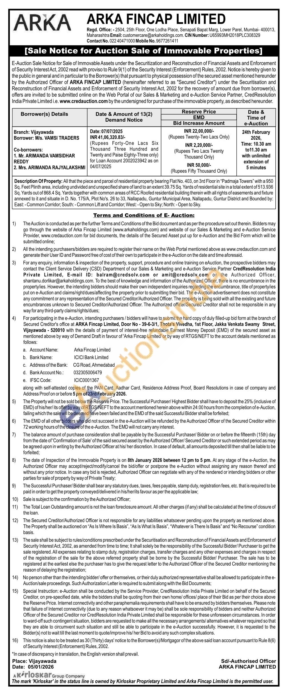 Description Of Property: All that the piece and parcel of residential property bearing Flat No. 403, on 3rd Floor in "Padmaja Towers" with a 950 Sq. Feet Plinth area, including undivided and unspecified share of land to an extent 39.75 Sq. Yards of residential site in a total extent of 513.936 Sq. Yards out of 868.4 Sq. Yards together with common areas of RCC Roofed residential building therein with all rights of easements and fixture annexed to it and situate in D. No. 175/A, Plot No's. 26 to 33, Nallapadu, Guntur Municipal Area, Nallapadu, Guntur District and Bounded by: East: - Common Corridor; South: - Common Lift and Corridor; West: - Open to Sky; North: - Open to Sky.