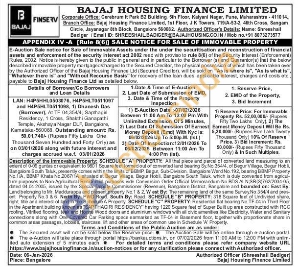 Description of the Immovable Property: SCHEDULE "A" PROPERTY: All that piece and parcel of converted land measuring to an extent of 0-09 guntas or equivalent to 9801 Square feet formed out of converted land bearing Sy. No.354/4, of Begur Village, Begur Hobli, Bangalore South Taluk, presently comes within the limits of BBMP, Begur, Sub-Division, Bangalore Ward No. 192, bearing BBMP Property No.1/A, BBMP Khata No.2067/1A, situated at Begur Village, Begur Hobli, Bangalore South Taluk, which is duly converted from agricul ture purposes to Non-Agricultural Residential purposes vide Conversion Order Official Memorandum No.BDS.ALN;SR(S)762/2004-05, dated 04.04.2005, issued by the Special Deputy Commissioner (Revenue), Bangalore District, Bangalore and bounded on: East By: Land belonging to Mr. Maddurappa and present property No.1 & 2, West By: The remaining land of the same Survey.No.354/4 and pres-ent Property No.3 & 6, North By: PWD Road, South By: Road. SCHEDULE "B" PROPERTY: 318 Square feet of Undivided share, right, title and interest of land in the Schedule A Property, SCHEDULE "C" PROPERTY: Residential flat bearing No.TF-04 in Third Floor in the Apartment building known as "SAPTHAGIRI RESIDENCY" having 1220 Square feet of Super Built up area constructed with RCC roofing, Vitrified flooring, teak and Honne Wood doors and aluminium windows with all civic amenities like Electricity, Water and Sanitary connections along with One Covered Car Parking space earmarked as TF-04 in Basement floor, together with proportionate share in common areas passages, lobbies, staircase, lift and other areas of common use in Schedule 'A' Property.