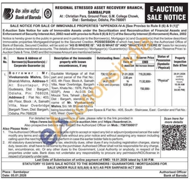 Equitable Mortgage of all that o- part and parcel of the Flat No.: : 403, 4th Floor, Block-A, Sainath , Town, Khata No.: 1976, Plot No.: , 933(P). Area: Ac.0.05 Dec. Mouza: Tora, Tahasil Bargarh, Dist: Bargarh, standing in the name of Mr. Vivekananda