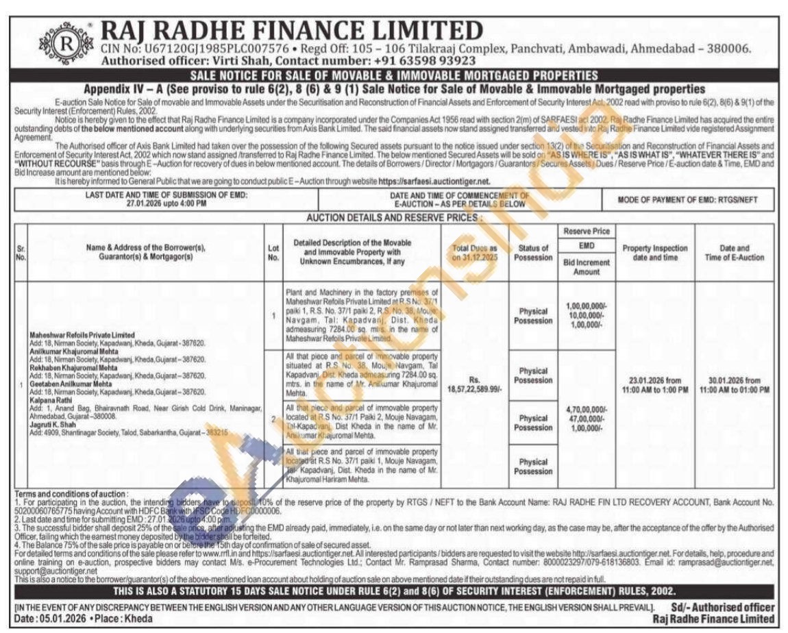All that piece and parcel of immovable property situated at R.S No. 38, Mouje Navgam, Tal Kapadvanj, Dist. Kheda admeasuring 7284.00 sq. mtrs, in the name of Mr. Anilikumar Khajuromal Mehta All that piece and parcel of immovable property located at R.S No. 37/1 Palki 2, Mouje Navagam, Tal-Kapedvanj, Dist Kheda in the name of Mr. Anilkumar Khajuromal Menta All that piece and parcel of immovable property located at R.S No. 37/1 palki 1, Mouje Navagam, Tal-Kapadvanj, Dist. Kheda in the name of Mr. Khajuromal Hariram Mehta