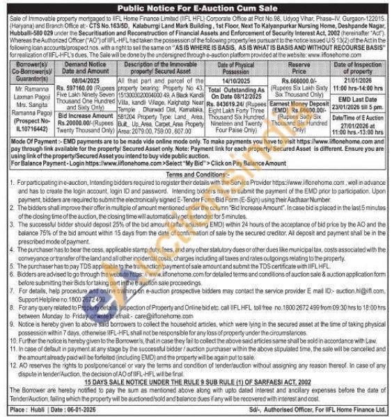 All that part and parcel of the property bearing Property No 43. 151300302000400049 049. A Black Kandil Vila, kandi Vilage, Kalghatgi Near Temple Dhawad Dist, Kamatika. 581204 Property Type Land Area, But Up Ares, Carpet Anee Property Areer: 2079.00.758.00.607.00