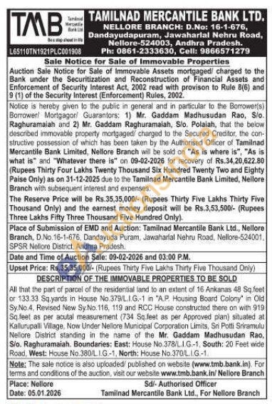 All that the part of parcel of the residential land to an extent of 16 Ankanas 48 Sq.feet or 133.33 Sq yards in House No.379/L.I.G.-1 in "A.P. Housing Board Colony in Old Sy.No.4, Revised New Sy.No.116, 119 and RCC House constructed there on with 919 Sq feet as per acutal measurement (734 So feel as per Approved plan) situated at Kallurupalli Village, Now Under Nellore Municipal Corporation Limits, Sri Potti Sriramulu Nellore District standing in the name of the Mr. Gaddam Madhusudan Rao, S/o. Raghuramaiah. Boundaries: East: House No 378/LI.G-1, South: 20 Feet wide Road, West: House No.380/L 1.G-1, North; House No. 370/LIG-1