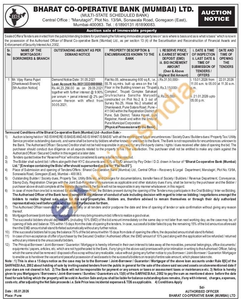 Flat No.05, admeasuring 600 sq.ft., le., : 55.76 sq.mtrs, built up area on the 1st Floor in the Building known as "Tirupati Complex", Tirupati Complex Sahakari Gruhrachana Sanstha Maryadit constructed on Plot No.2 & 3 out of Survey No.25, Hissa No.2 situated at Dhankawadi, Pune Satara Road, Pune-411043 within the Registration District of Pune, Sub District, Taluka Haveli, Sub Registrar, Haveli and within the limits of Pune Municipal Corporation