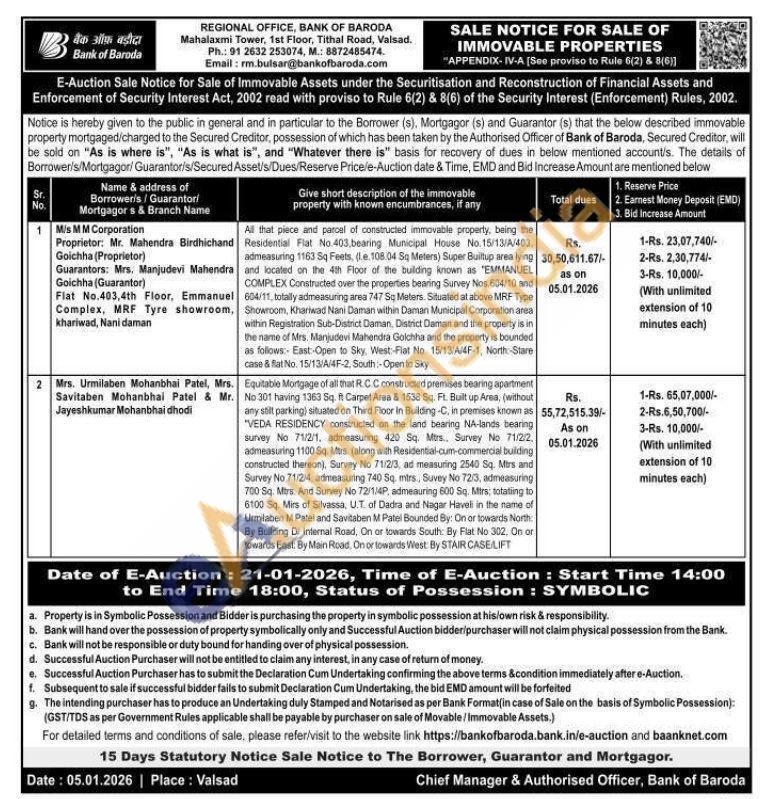 All that piece and parcel of constructed immovable property, being the Residential Flat No.403,bearing Municipal House No. 15/13/A/403, admeasuring 1163 Sq Feets, (Le 108.04 Sq Meters) Super Builtup area lying and located on the 4th Floor of the building known as 'EMMANUEL COMPLEX Constructed over the properties bearing Survey Nos. 604/10 and 604/11, totally admeasuring area 747 Sq Meters. Situated at above MRF Type Showroom, Kharwad Nani Daman within Daman Municipal Corporation area within Registration Sub-District Daman, District Daman and the property is in the name of Mrs. Manjudevi Mahendra Golchha and the property is bounded as follows:- East-Open to Sky, West-Flat No. 15/13/A/4F-1, North-Stare case & Bat No. 15/13/A/4F-2. South: Open to Sky