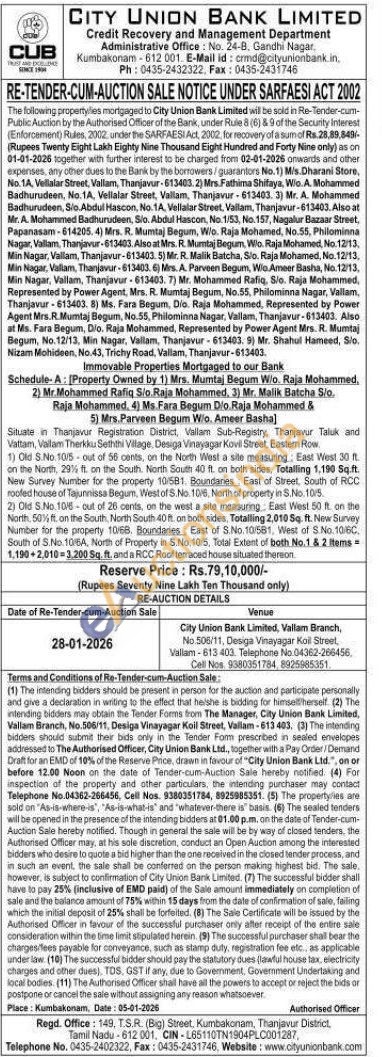 Situate in Thanjavur Registration District, Vallam Sub-Registry, Thanjavur Taluk and Vattam, Valam Therkku Seththi Village, Desiga Vinayagar Kovil Street, Eastern Row, 1) Old S.No. 10/5 out of 56 cents, on the North West a site measuring East West 30 ft. on the North, 29 ft on the South. North South 40 ft on both sides. Totalling 1,190 Sq.ft. New Survey Number for the property 10/581. Boundaries East of Street, South of RCC roofed house of Tajunnissa Begum, West ofS No. 106, North of property in S.No.10/5. 21 Old S.No. 1016-out of 20 cents, on the west a site measuring East West 50 ft on the North, 50% ft. on the South. North South 40ft on both sides, Totalling 2,010 Sq. ft. New Survey Number for the property 10/68. Boundaries East of S.No. 10/581, West of S.No. 10/6C South of S.No.106A, North of Property in S.No.10/5, Total Extent of both No.1 & 2 items 1,190+2,010-3,200 Sq. ft. and a RCC Roof terraosd house situated thereon.
