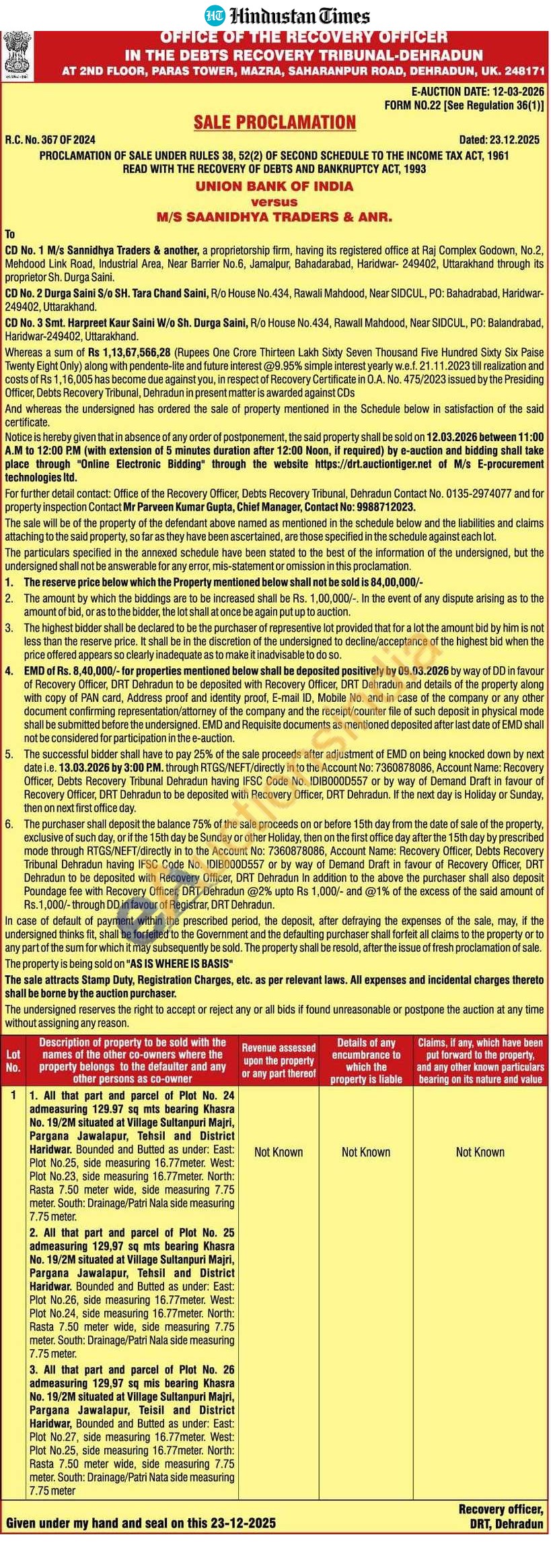 1. All that part and parcel of Plot No. 24 admaasuring 129.97 sq mts bearing Khasra No. 19/2M situated at Village Sultanpuri Majri, Pargana Jawalaper, Tahsil and District Haridwar. Bounced and Butted as under East: Plot No:25, sice measuring 16.77meter West: Plot No.23, side measuring 16.77meter. North: Rasta 750 meter wide, side massuring 7.75 meter: South Drainage Patri Nala sido measured