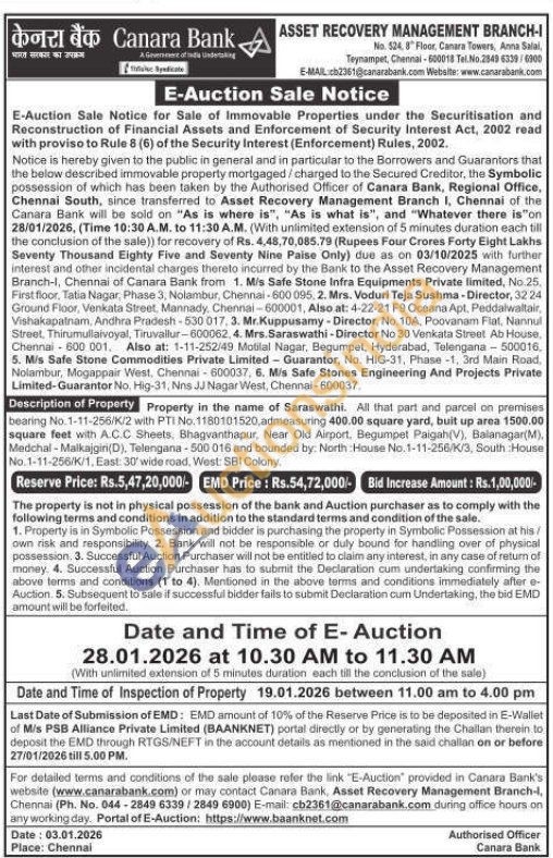 All that part and parcel on premises bearing No.1-11-256/K/2 with PTI No.1180101520, admeasuring 400.00 square yard, buit up area 1500.00 square feet with A.C.C Sheets, Bhagvanthapur, Near Old Airport. Begumpet Paigah(V), Balanagar(M), Medchal-Malkajgiri(D), Telengana-500 016 and bounded by: North House No.1-11-256/K/3, South House No.1-11-256/K/1, East: 30 wide road, West: SBI Colony.