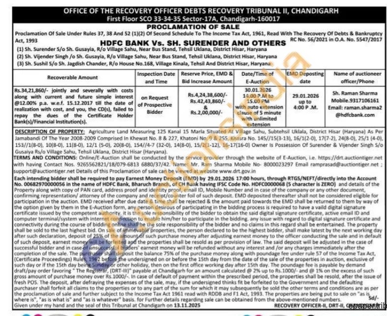DESCRIPTION OF PROPERTY: Agriculture Land Measuring 125 Kanal 15 Maria Situated At Village Sahu, Subtehsil Uldala, District Hisar (Haryana) As Per Jamabandi Of The Year 2008-2009 Comprised In Khewat No. 8 & 227, Khatoni No. 9 & 255, Khasra No. 145//15(3-13), 16/1(2-0), 17(7-2), 24(8-0), 25/1 (4-0), 153//1(8-0), 10(8-0), 11(8-0), 12/1 (5-0), 20(8-0), 154//4-7 (32-0), 14(8-0), 15/2(1-12), 16-17[16-0) Owner is Possession Of Surender & Vijender Singh 5/0 Gusaiya Rs/o Village Sahu, Tehsil Uklana, District Hisar (Haryana).
