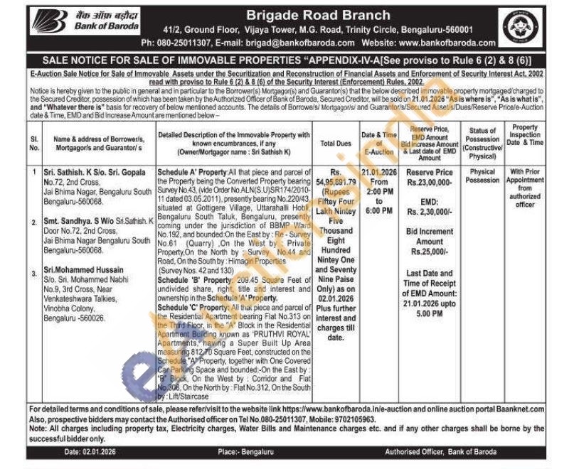 Schedule 'A' Property: All that piece and parcel of the property being the Converted property bearing Survey No.43, presently bearing BBMP No.220/43, situated at Gottigere Village. Uttarahalli Hobli, Bengaluru South Taluk. Bengaluru, presently coming under the jurisdiction of BBMP ward No. 192, measuring 1 acre and 14 guntas vide order bearing No ALN(S.U)SR 174/2010-11, dated 03.05.2011 and bounded: On the East by: Land bearing Survey No.61 (Quarry) On the West by: Private Property, On the North by Land bearing Survey No.44 and Road. On the South by: Himagiri Properties (Survey Nos. 42 and 130) SCHEDULE 'B' PROPERTY: 208.15 Square Feet of undivided share, right, title and interest and ownership in the Schedule "A" Property. SCHEDULE 'C' PROPERTY: Residential Apartment bearing Flat No.315, on the Third (3rd) Floor, in 'A' Block, in the Residential Apartment building known as "PRUTHVI ROYAL", apartments, having Super Built Up Area measuring 807.66 Square Feet, constructed on the Schedule "A" property, together with One Covered Car parking space and bounded on the: East by: 'B' Block, West by: Corridor & Flat No.303, North by: Flat No.314, South by: Flat No. 316.