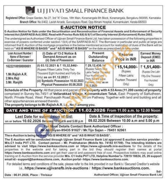 Schedule of the Property: All that piece and parcel of the property with 4.53 Ares (11.200 cents) of property comprised in Survey No.745/1 of Vellarakkad Village, Kunnamkulam Taluk, East: Property of Saifudheen, North: Private Road, West: Panchayath Road, South: 90 cm Pathway. Together with land and building and all other appurtenances annexed thereto
