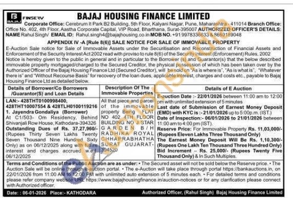 All that piece and parcel of the immovable property Being FLAT NO 402 4TH FLOOR BUILDING NO J STAR GARDEN B/H RADHIKA ROYAL CHHAPRABHATHA SURAT GUJARAT-394520