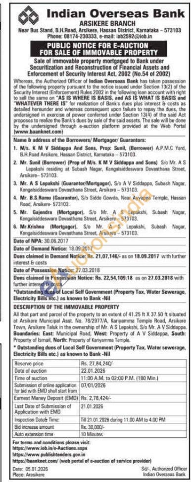 All that part and parcel of the property to an extent of 41.25 ft X 37.50 ft situated at Arsikere Municipal Asst. No. 78/2977/A, Kariyamma Temple Road, Arsikere Town, Arsikere Taluk in the ownership of Mr. A S Lepakshi, S/o Mr. A V Siddappa. Boundaries: East: Municipal Road, West: Property of A V Siddappa, South: Property of Ismail, North: Property of Kariyamma Temple