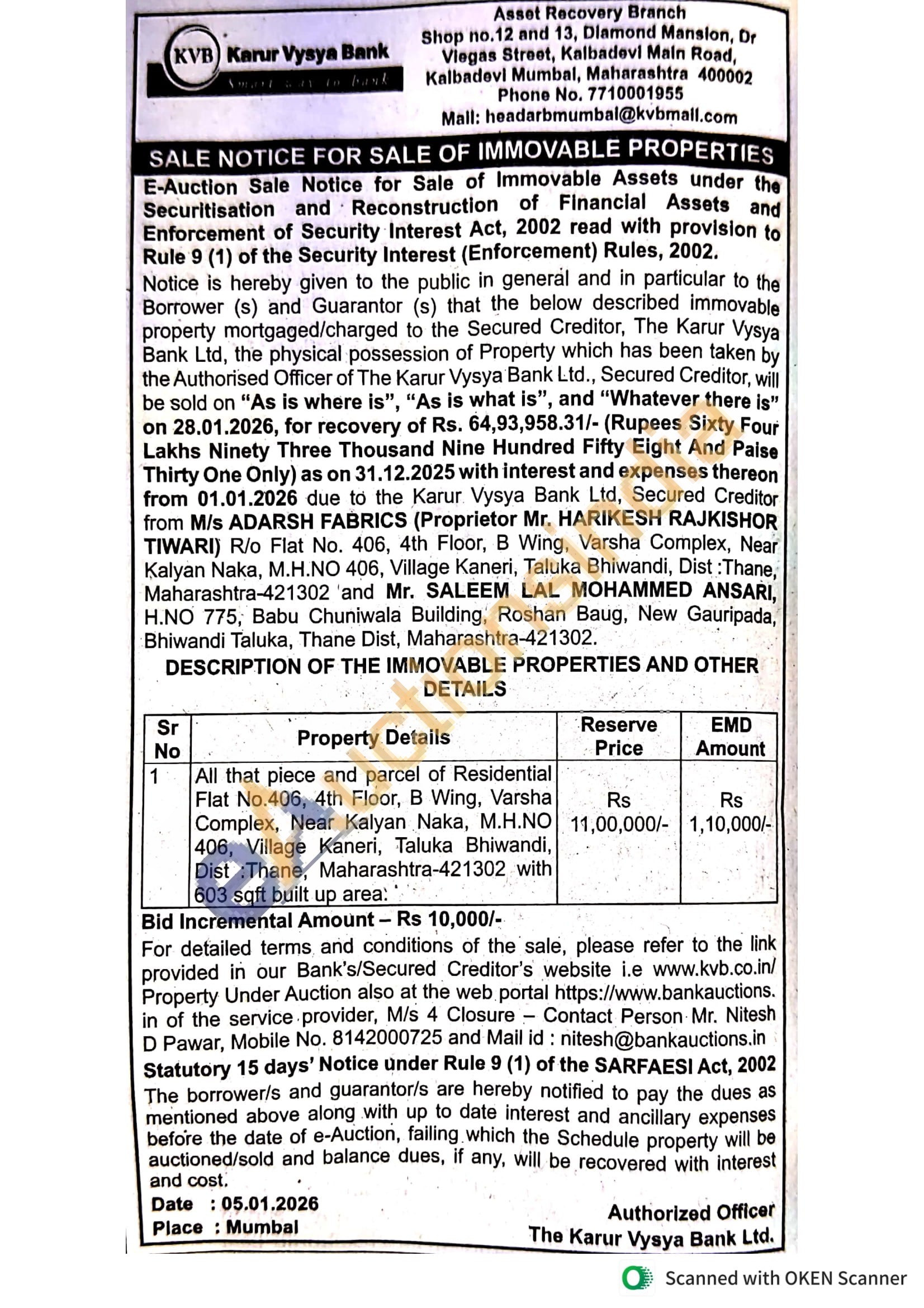 All that piece and parcel of Residential Flat No.406, 4th Floor, B Wing, Varsha Complex, Near Kalyan Naka, M.H.NO 406, Village Kaneri, Taluka Bhiwandi, Dist:Thane, Maharashtra-421302 with 603 sqft built up area: