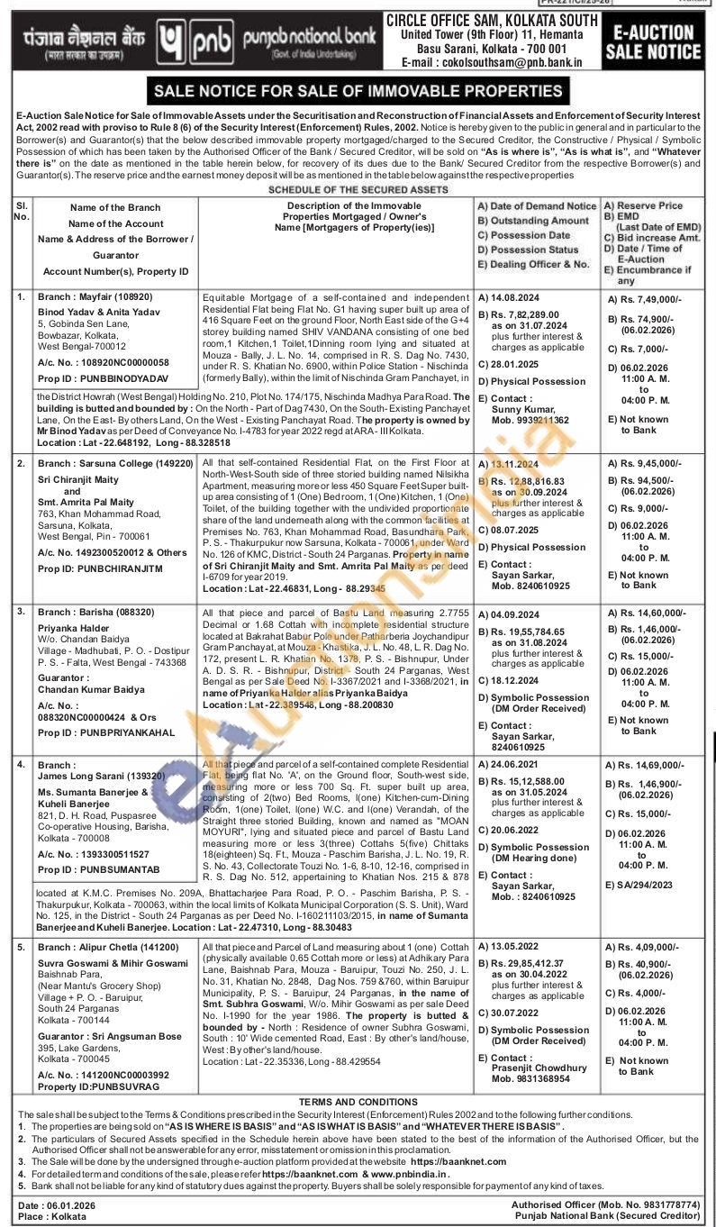 All that piece and parcel of a self-contained complete Residential Flat, being flat No. 'A', on the Ground floor, South-west side, measuring more or less 700 Sq. Ft. super built up area, consisting of 2(two) Bed Rooms, (one) Kitchen-cum-Dining Room, 1(one) Toilet, (one) W.C. and I(one) Verandah, of the Straight three storied Building, known and named as "MOAN MOYURI", lying and situated piece and parcel of Bastu Land measuring more or less 3(three) Cottahs 5(five) Chittaks 18(eighteen) Sq. Ft., Mouza - Paschim Barisha, J. L. No. 19, R. S. No. 43, Collectorate Touzi No. 1-6, 8-10, 12-16, comprised in R. S. Dag No. 512, appertaining to Khatian Nos. 215 & 878 A) 2-B) R a P C) 2- D) S (1 Prop ID: PUNBSUMANTAB a P E) C S M located at K.M.C. Premises No. 209A, Bhattacharjee Para Road, P. O. Paschim Barisha, P. S.-Thakurpukur, Kolkata 700063, within the local limits of Kolkata Municipal Corporation (S. S. Unit), Ward