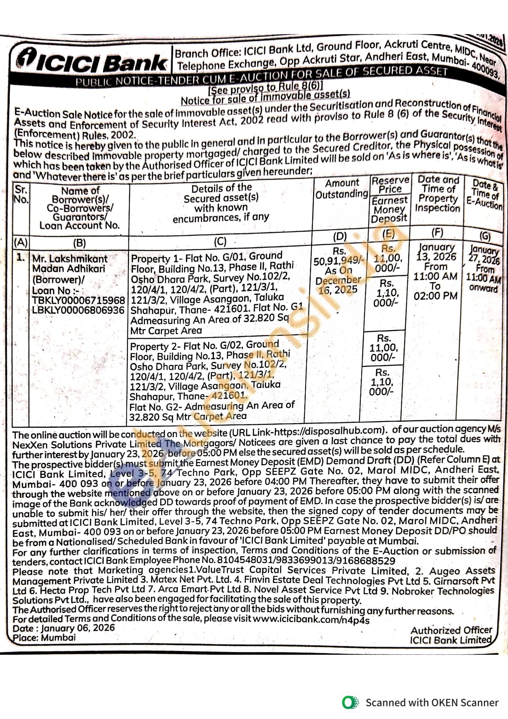 Property 2- Flat No. G/02, Ground Floor, Building No.13, Phase II, Rathi Osho Dhara Park, Survey No.102/2, 120/4/1, 120/4/2, (Part), 121/3/1, 121/3/2, Village Asangaon, Taluka Shahapur, Thane-421601. Flat No. G2- Admeasuring An Area of 32.820 Sq Mtr Carpet Area