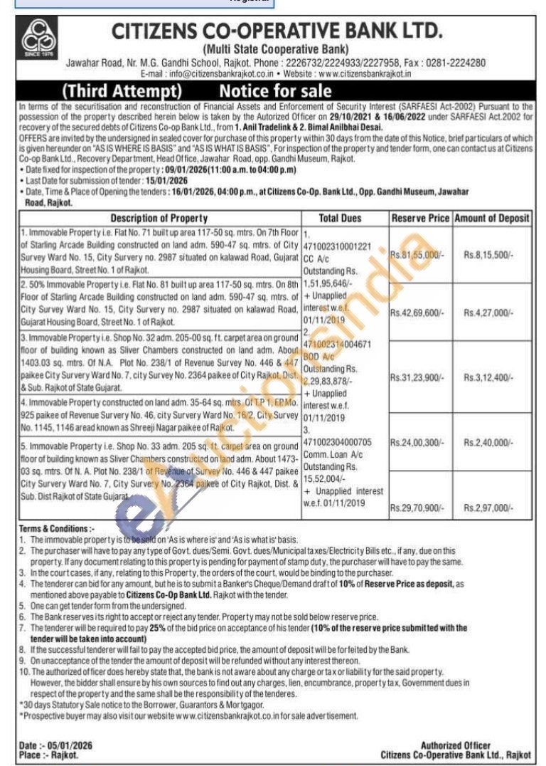 5. Immovable Property i.e. Shop No. 33 adm. 205 sq. ft. carpet area on ground floor of building known as Sliver Chambers constructed on land adm. About 1473-03 sq. mtrs. Of N. A. Plot No. 238/1 of Revenue of Survey No. 446 & 447 paikee City Survery Ward No. 7, City Survery No. 2364 paikee of City Rajkot, Dist. & Sub. Dist Rajkot of State Gujarat.