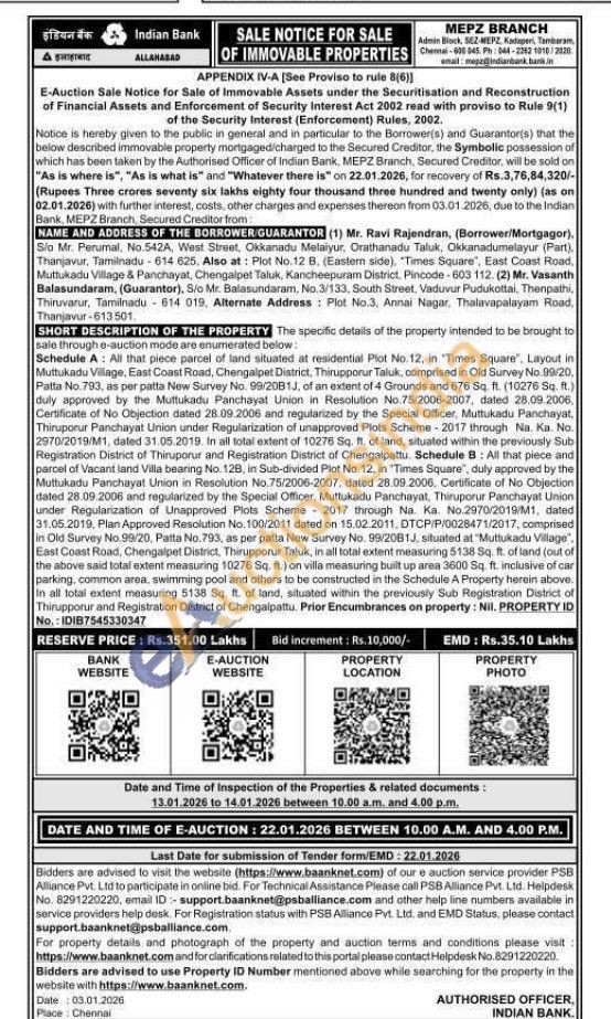 Schedule A: All that piece parcel of land situated at residential Plot No.12, in 'Times Square", Layout in Muttukadu Village, East Coast Road, Chengalpet District, Thirupporur Taluk, comprised in Old Survey No. 99/20. Patta No.793, as per patta New Survey No. 99/20B1J, of an extent of 4 Grounds and 676 Sq. ft. (10276 Sq. ft.) duly approved by the Muttukadu Panchayat Union in Resolution No.75/2006-2007, dated 28.09.2006, Certificate of No Objection dated 28.09.2006 and regularized by the Special Officer, Muttukadu Panchayat, Thiruporur Panchayat Union under Regularization of unapproved Plots Scheme 2017 through Na. Ka. No. 2970/2019/M1, dated 31.05.2019. In all total extent of 10276 Sq. ft. of land, situated within the previously Sub Registration District of Thiruporur and Registration District of Chengalpattu. Schedule 8: All that piece and parcel of Vacant land Villa bearing No. 128, in Sub-divided Plot No. 12, in "Times Square", duly approved by the Muttukadu Panchayat Union in Resolution No.75/2006-2007, dated 28.09.2006. Certificate of No Objection dated 28.09.2006 and regularized by the Special Officer, Muttukadu Panchayat, Thiruporur Panchayat Union under Regularization of Unapproved Plots Scheme 2017 through Na. Ka. No.2970/2019/M1, dated 31.05.2019, Plan Approved Resolution No. 100/2011 dated on 15.02.2011, DTCP/P/0028471/2017, comprised in Old Survey No.99/20, Patta No. 793, as per patta New Survey No. 99/2081J, situated at "Muttukadu Village", East Coast Road, Chengalpet District, Thirupporur Taluk, in all total extent measuring 5138 Sq. ft. of land (out of the above said total extent measuring 10276 Sq. ft.) on villa measuring built up area 3600 Sq. ft. inclusive of car parking, common area, swimming pool and others to be constructed in the Schedule A Property herein above. In all total extent measuring 5138 Sq. ft. of land, situated within the previously Sub Registration District of Thirupporur and Registration District of Chengalpattu. Prior Encumbrances on property: Nil. PROPERTY ID No.: IDIB7545330347