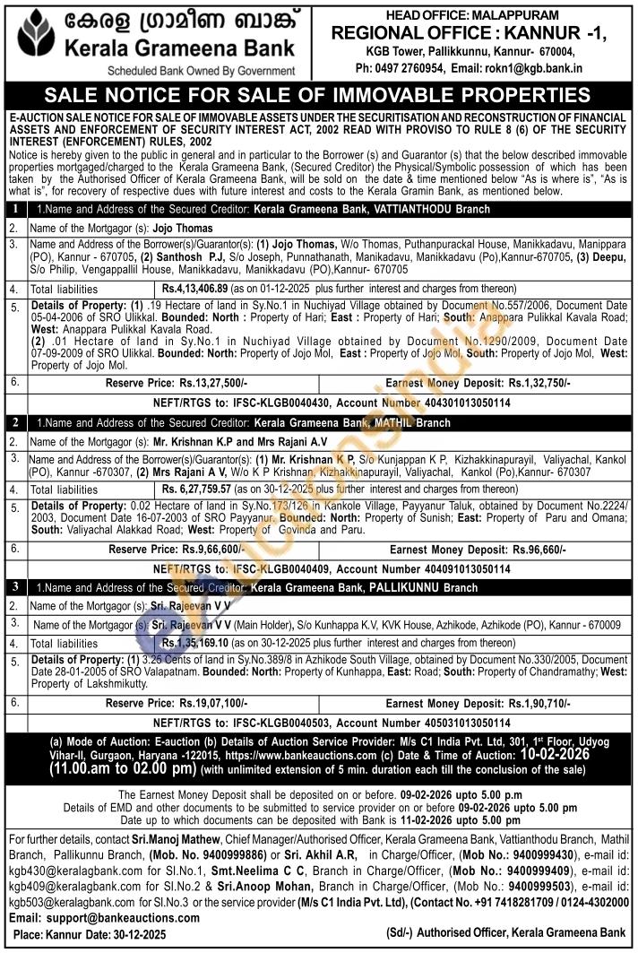 Details of Property: (1) 19 Hectare of land in Sy.No.1 in Nuchiyad Village obtained by Document No.557/2006, Document Date 05-04-2006 of SRO Ulikkal. Bounded: North: Property of Hari; East: Property of Hari: South: Anappara Pulikkal Kavala Road; West: Anappara Pulikkal Kavala Road.
