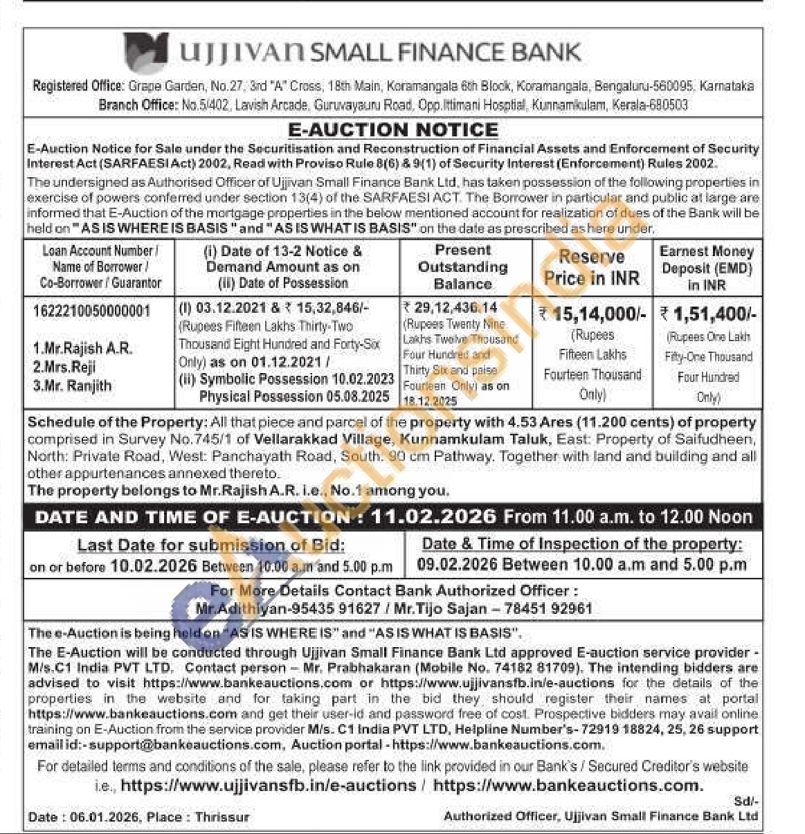 Schedule of the Property: All that piece and parcel of the property with 4.53 Ares (11.200 cents) of property comprised in Survey No.745/1 of Vellarakkad Village, Kunnamkulam Taluk, East: Property of Saifudheen, North: Private Road, West: Panchayath Road, South: 90 cm Pathway. Together with land and building and all other appurtenances annexed thereto.