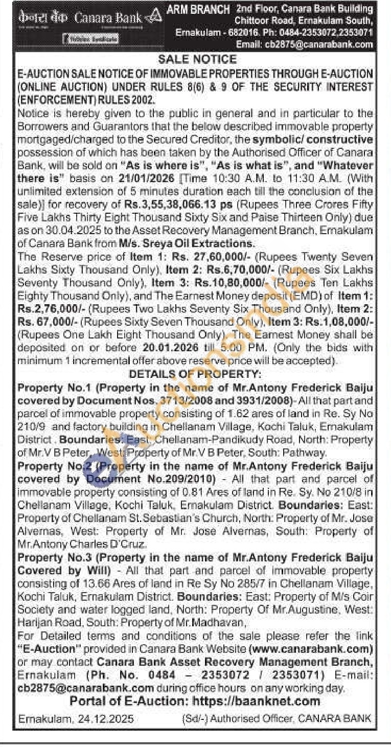 Property No.2 (Property in the name of Mr.Antony Frederick Baiju covered by Document No.209/2010) All that part and parcel of immovable property consisting of 0.81 Ares of land in Re. Sy. No 210/8 in Chellanam Village, Kochi Taluk, Ernakulam District. Boundaries: East: Property of Chellanam St. Sebastian's Church, North: Property of Mr. Jose Alvernas, West: Property of Mr. Jose Alvernas, South: Property of Mr.Antony Charles D'Cruz.