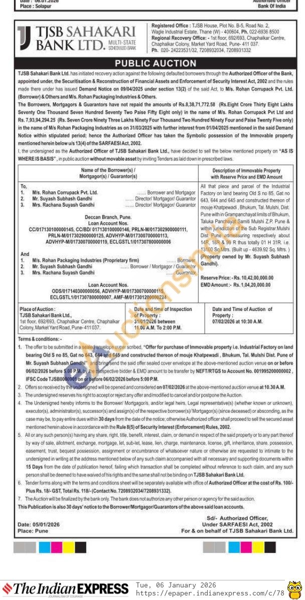 All that piece and parcel of the industrial Factory on land bearing Old & no 85, Gat no 643 684 and 645 and constructed thereon of moje Khatpewadi, Bhukum, Tal Mush Dist Pune with in Grampanchayat limits of Bhukum, Taluka Panchayat Samili Mushi Z.P. Pune & within jurisdiction of the Sub Ragistrar Mushi Dist Puns admeasuring respectively about 14R 188 & 19 R thus totally 01 H 31R. ie. 13100 Sq Mirs. (Built up-4639.02 5q. Mtrs) (Property owned by Mr. Suyash Subhash Gandhi).