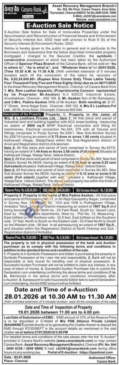 Property 1: Property in the name of M/s. S L Leathers Private Ltd, Item 1: All that piece and parcel of Industrial land and building together with ACC sheet building measuring an extent of 9600 sq.ft 90HP Electrical connection and fitting for machineries, Electrical connection No.304, 279 with all fixtures and fittings comprised in Punja Survey No.428/1, New Sub-division Survey No.428/1A having an extent of 0.75 Ares or acres 1.86 cents situated in Kathiavadi Village, Walaja Taluk within the Sub-Registration district of Arcot and Registration district of Arakonam. Item 2: All that piece and parcel of land comprised in Survey No.427/2. having an extent of 1.44 Ares or Acres 3.56 cents (Full extent) Situated at Kathiavadi Village, Walaja Taluk, Vellore District, Item 3: All that piece and parcel of land comprised in Survey No.563, New Sub Division Survey No.563/6, having an extent of 0.10 Ares or acres 0.25 cent (full extent) situated a Kathiavadi Village, Walaja Taluk, Vellore District. Item 4: All that piece and parcel of land comprised in Survey No.563, New Sub division Survey No.563/9, having an extent of 0.12 ares or acres 0.30 cents (Full extent) together with well, situated a Kathiavadi Village, Walaja Taluk, Vellore District. The above said property lies within the limits of Kathiavadi Village, Walaja Taluk, Vellore District.