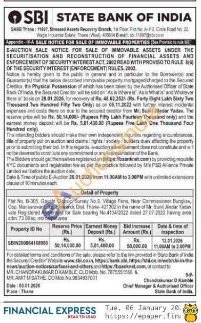 Flat No. B-305, Gayatri Classic, Survey No 9. Vilage Fene, Near Commissioner Bunglow, Opp. Mansarovar Lake, Bhiwandi, Dist. Thane-421302 in the name of Mr. Sunil Jiledar Yadav vide Registered Agreement for Sale bearing No.4134/2022 dated 27.07 2022 having area adm 73.96 sq. mtr carpet area