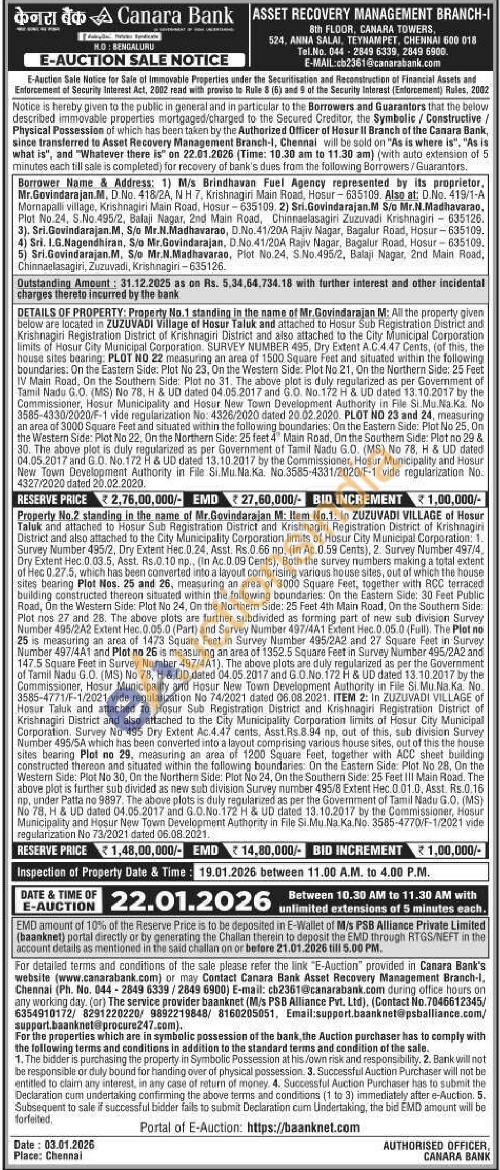 Property No.2 standing in the name of Mr.Govindarajan M: Item No.1: In ZUZUVADI VILLAGE of Hosur Taluk and attached to Hosur Sub Registration District and Krishnagiri Registration District of Krishnagiri District and also attached to the City Municipality Corporation limits of Hosur City Municipal Corporation: 1. Survey Number 495/2, Dry Extent Hec. 0.24, Asst. Rs.0.66 np. (In Ac.0.59 Cents), 2. Survey Number 497/4, Dry Extent Hec.0.03.5, Asst. Rs.0.10 пр., (In Ac.0.09 Cents), Both the survey numbers making a total extent of Hec 0.27.5, which has been converted into a layout comprising various house sites, out of which the house sites bearing Plot Nos. 25 and 26, measuring an area of 3000 Square Feet, together with RCC terraced building constructed thereon situated within the following boundaries: On the Eastern Side: 30 Feet Public Road, On the Western Side: Plot No 24, On the Northern Side: 25 Feet 4th Main Road, On the Southern Side: Plot nos 27 and 28. The above plots are further subdivided as forming part of new sub division Survey Number 495/2A2 Extent Hec.0.05.0 (Part) and Survey Number 497/4A1 Extent Hec.0.05.0 (Full), The Plot no 25 is measuring an area of 1473 Square Feet in Survey Number 495/2A2 and 27 Square Feet in Survey Number 497/4A1 and Plot no 26 is measuring an area of 1352.5 Square Feet in Survey Number 495/2A2 and 147.5 Square Feet in Survey Number 497/4A1). The above plots are duly regularized as per the Government of Tamil Nadu G.O. (MS) No 78, H & UD dated 04.05.2017 and G.O.No. 172 H & UD dated 13.10.2017 by the Commissioner, Hosur Municipality and Hosur New Town Development Authority in File Si. Mu.Na.Ka. No. 3585-4771/F-1/2021 vide regularization No 74/2021 dated 06.08.2021. ITEM 2: In ZUZUVADI VILLAGE of Hosur Taluk and attached to Hosur Sub Registration District and Krishnagiri Registration District of Krishnagiri District and also attached to the City Municipality Corporation limits of Hosur City Municipal Corporation. Survey No 495 Dry Extent Ac.4.47 cents, Asst.Rs.8.94 np, out of this, sub division Survey Number 495/5A which has been converted into a layout comprising various house sites, out of this the house sites bearing Plot no 29, measuring an area of 1200 Square Feet, together with ACC sheet building constructed thereon and situated within the following boundaries: On the Eastern Side: Plot No 28, On the Western Side: Plot No 30, On the Northern Side: Plot No 24, On the Southern Side: 25 Feet III Main Road. The above plot is further sub divided as new sub division Survey number 495/8 Extent Hec. 0.01.0, Asst. Rs.0.16 np, under Patta no 9897. The above plots is duly regularized as per the Government of Tamil Nadu G.O. (MS) No 78, H & UD dated 04.05.2017 and G.O.No.172 H & UD dated 13.10.2017 by the Commissioner, Hosur Municipality and Hosur New Town Development Authority in File Si. Mu.Na. Ka. No. 3585-4770/F-1/2021 vide regularization No 73/2021 dated 06.08.2021.