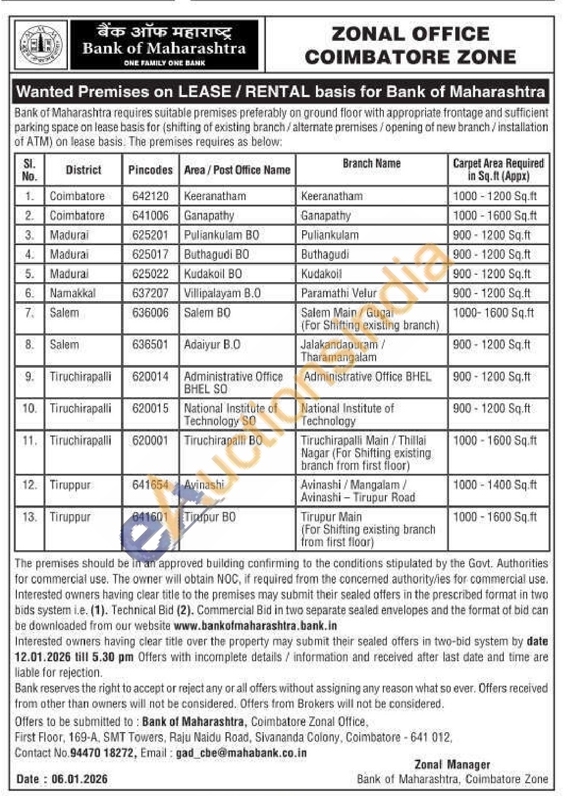 Bank of Maharashtra Gold Auctions Auction in Coimbatore