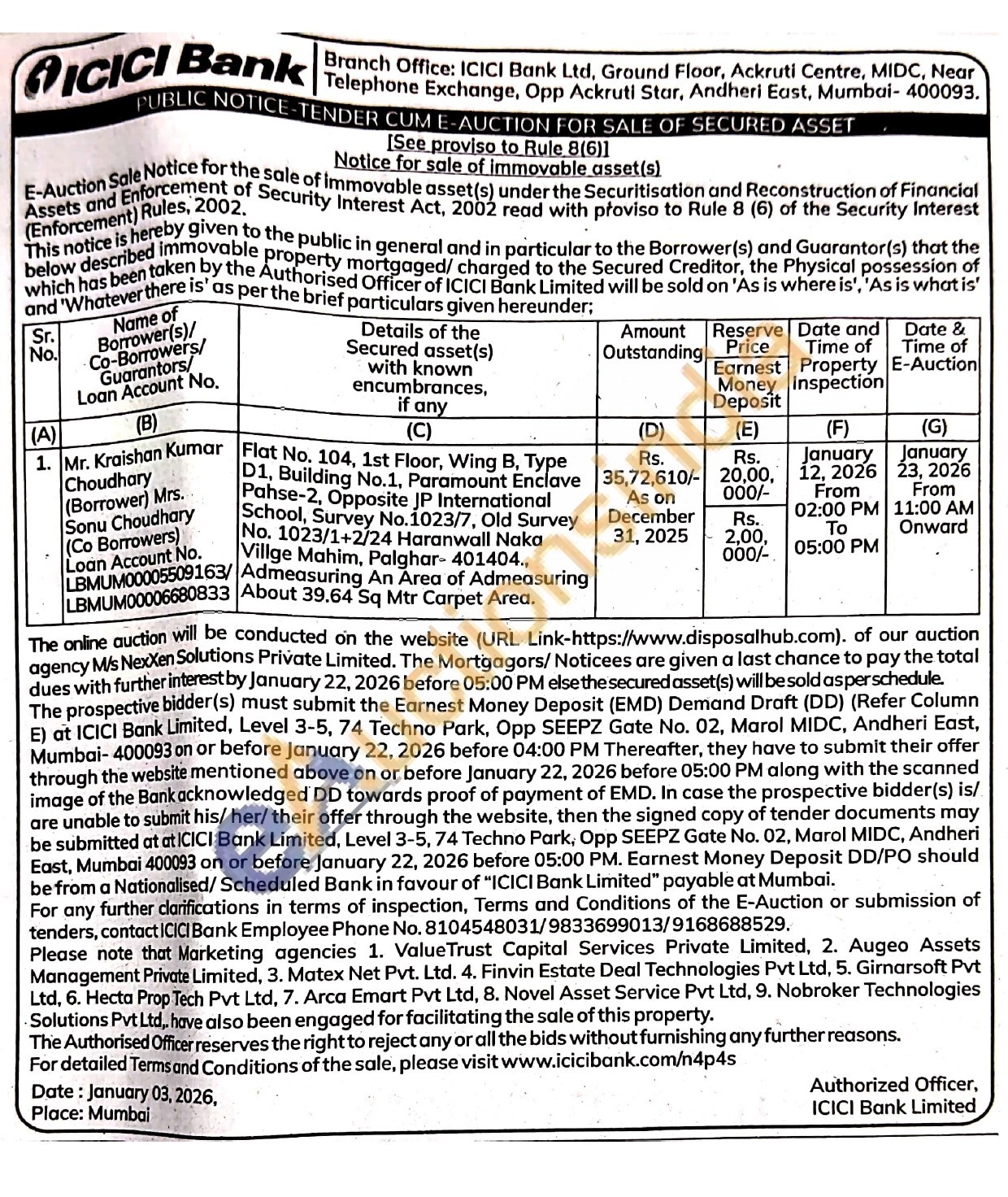 Flat No. 104, 1st Floor, Wing B, Type D1 Building No1, Paramount Enclave Pahse-2, Opposite JP International School, Survey No.1023/7, Old Survey No. 1023/1+2/24 Haranwall Naka Villge Mahim, Palghar- 401404., Admeasuring An Area of Admeasuring About 39.64 Sq Mtr Carpet Area.