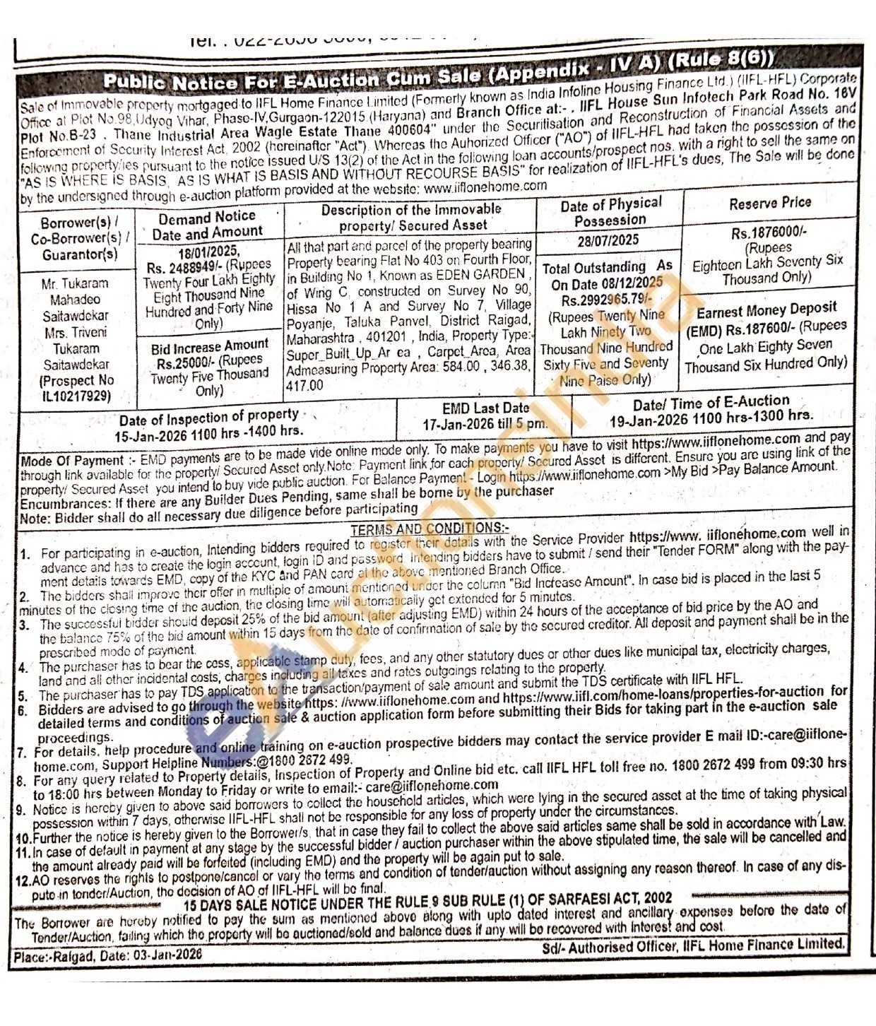 All that part and parcel of the property bearing Property bearing Flat No 403 on Fourth Floor, in Building No 1, Known as EDEN GARDEN of Wing C constructed on Survey No 90, Hissa No 1 A and Survey No 7, Village Poyanje, Taluka Panvel, District Raigad, Maharashtra 401201, India, Property Type: Super Built Up Area, Carpet Area, Area Admeasuring Property Area: 584.00, 346.38, 417.00