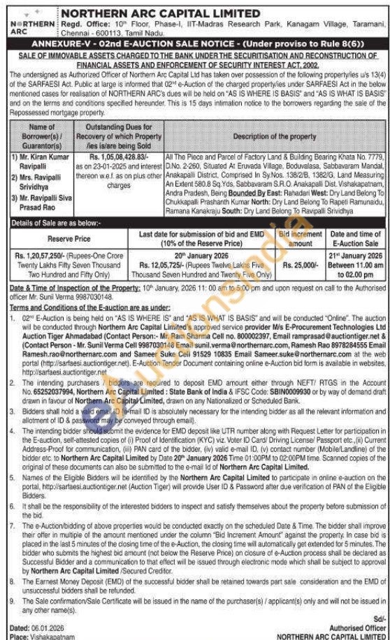 All The Piece and Parcel of Factory Land & Building Bearing Knata No. 7779, D.No. 2-260, Situated At Eruvada Village, Boduvalasa, Sabbavaram Mandal, Anakapalli District, Comprised In Sy Nos. 138/2/B, 1382/G, Land Measuring An Extent 580.8 Sq. Yds, Sabbavaram S.R.O. Anakapalli Dist. Vishakapatnam, Andra Pradesh, Being Bounded By East: Rahadari West: Dry Land Belong To Chukkapalli Prashanth Kumar North: Dry Land Belong To Rapeti Ramunaidu, Ramana Kanakraju South: Dry Land Belong To Ravipalli Srividhya