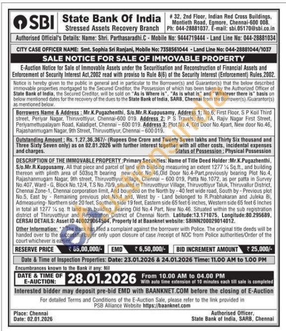 DESCRIPTION OF THE IMMOVABLE PROPERTY: Primary Securities: Name of Title Deed Holder: Mr.K.Pugazhenthi, S/o.Mr.R.Kuppusamy. All that piece and parcel of land with building measuring an extent 1277 % Sq.ft., and building thereon with plinth area of 503sq.ft bearing new door No.46,Old Door No.4-Part,previously bearing Plot No.4, Rajashanmugam Nagar, 9th street, Thiruvotfiyur village, Chennai-600 019, Patta No. 1072, as per patta in Survey No.407, Ward-G, Block No. 12/4, T.S No. 70/9, situated in Thiruvottiyur Village, Thiruvottiyur Taluk, Thiruvallur District, Chennal Zone-1, Chennai corporation limit, And bounded on the North by-40 feet wide road, South by-Previous plot No.5, East by Remaining previous plot No.4 and, West by Land belonged to R.Prabhakaran and Juleka Bi, Admeasuring-Northern side 20 feet, Southern side 19 feet, Eastern side 65 feet 6 inches, Western side 65 feet 6 inches in total all 1277 % sq. It land with building. Bearing Old No.4 Part, New No.46. Situated within the sub registration district of Thiruvottiyur and Registration District of Chennai North. Latitude: 13.171075, Longitude:80.295689, CERSAI