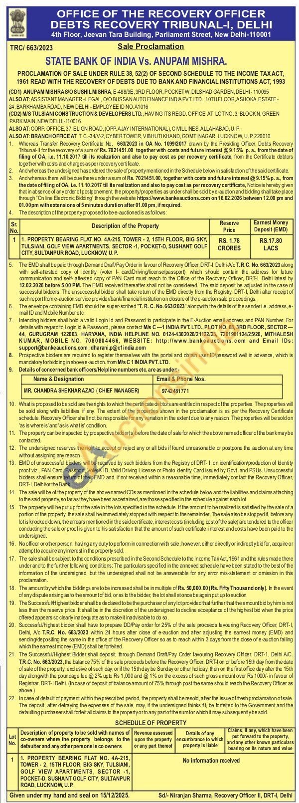 PROPERTY BEARING FLAT NO. 44-215, TOWER-2, 15TH FLOOR, BIG SKY TULSIANI, GOLF VIEW APARTMENTS, SECTOR -1, POCKET-D, SUSHANT GOLF CITY. SULTANPUR ROAD, LUCKNOW UP