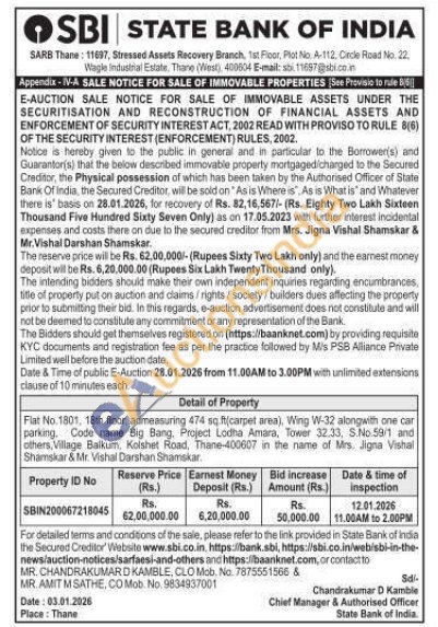 Flat No. 1801, 18th floor, admeasuring 474 sq.ft(carpet area), Wing W-32 alongwith one car parking, Code name Big Bang, Project Lodha Amara, Tower 32.33, S.No.59/1 and others, Village Balkum, Kolshet Road, Thane-400607 in the name of Mrs. Jigna Vishal Shamskar & Mr. Vishal Darshan Shamskar