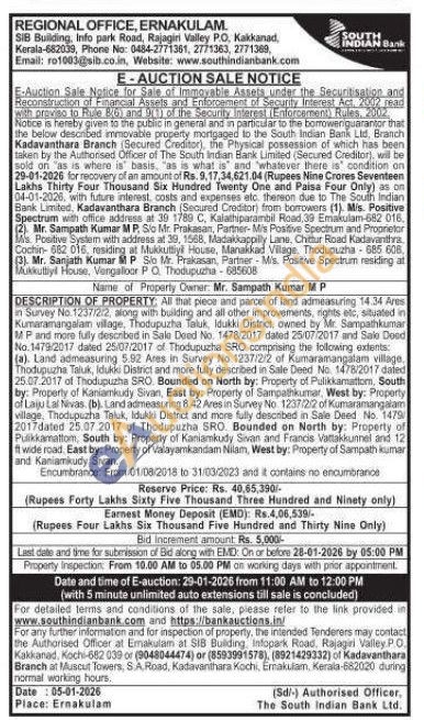DESCRIPTION OF PROPERTY: All that piece and parcel of land admeasuring 14.34 Ares in Survey No. 1237/2/2, along with building and all other improvements, righits etc, situated in Kumaramangalam village, Thodupuzha Taluk, Idukki District, owned by Mr. Sampathkumar MP and more fully described in Sale Deed No. 1478/2017 dated 25/07/2017 and Sale Deed No.1479/2017 dated 25/07/2017 of Thodupuzha SRO comprising the following extents: (a). Land admeasuring 5.92 Ares in Survey No. 1237/2/2 of Kumaramangalam village. Thodupuzha Taluk, Idukki District and more fully described in Sale Deed No. 1478/2017 dated 25.07.2017 of Thodupuzha SRO. Bounded on North by: Property of Pulikkamattom, South by: Property of Kaniamkudy Sivan, East by: Property of Sampathkumar, West by: Property of Laiju Lal Nivas. (b). Land admeasuring 8. 42 Ares in Survey No. 1237/2/2 of Kumaramangalam village, Thodupuzha Taluk, Idukiu District and more fully described in Sale Deed No. 1479 2017dated 25.07.2017 of Thodupuzha SRO. Bounded on North by: Property of Puikkamattom, South by: Property of Kaniamkudy Sivan and Francis Vattakkunnel and 12 ft wide road. East by: Property of Valayamkandam Nilam, West by: Property of Sampath kumar and Kaniamkudy Sivan.