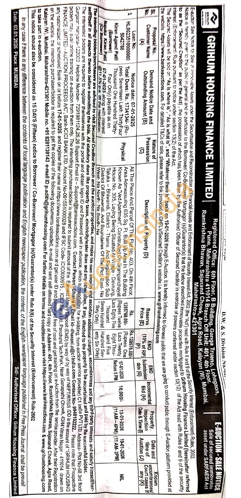 All The Piece And Parcel Of The Flat No. 403, On 4th Floor, Area Admeasuring 635 Sq. Ft. Built Up Area In The Building Known As "Ved Apartment", Constructed On Grampanchayat House No. 305, Laying Being Situated At Vilage - Devrung, Taluka Bhiwandi, District - Thane. And Registration Sub District Of Bhiwandi. And Boundaries Of The Plot: East-Na West- Na North- Na South-Na