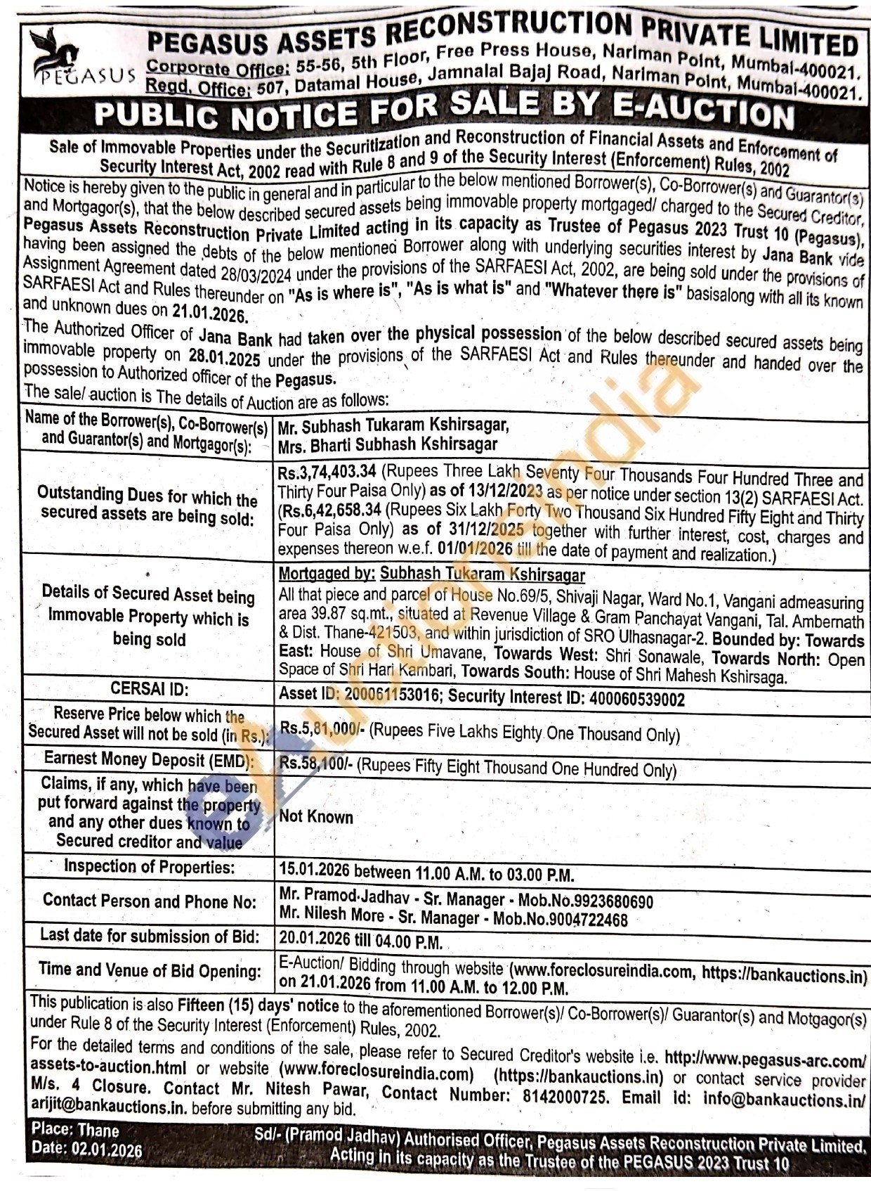 Mortgaged by: Subhash Tukaram Kshirsagar All that piece and parcel of House No.69/5, Shivaji Nagar, Ward No.1, Vangani admeasuring area 39.87 sq.mt., situated at Revenue Village & Gram Panchayat Vangani, Tal. Ambernath & Dist. Thane-421503, and within jurisdiction of SRO Ulhasnagar-2. Bounded by: Towards East: House of Shri Umavane, Towards West: Shri Sonawale, Towards North: Open Space of Shri Hari Kambari, Towards South: House of Shri Mahesh Kshirsaga