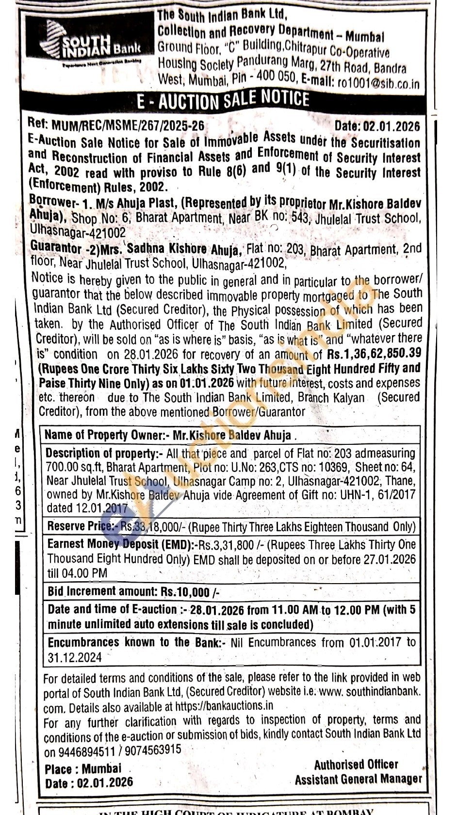 Description of property:- All that piece and parcel of Flat no: 203 admeasuring 700.00 sq.ft, Bharat Apartment, Plot no: U.No: 263,CTS no: 10369, Sheet no: 64, Near Jhulelal Trust School, Ulhasnagar Camp no: 2, Ulhasnagar-421002, Thane, owned by Mr.Kishore Baldev Ahuja vide Agreement of Gift no: UHN-1, 61/2017 dated 12.01.2017