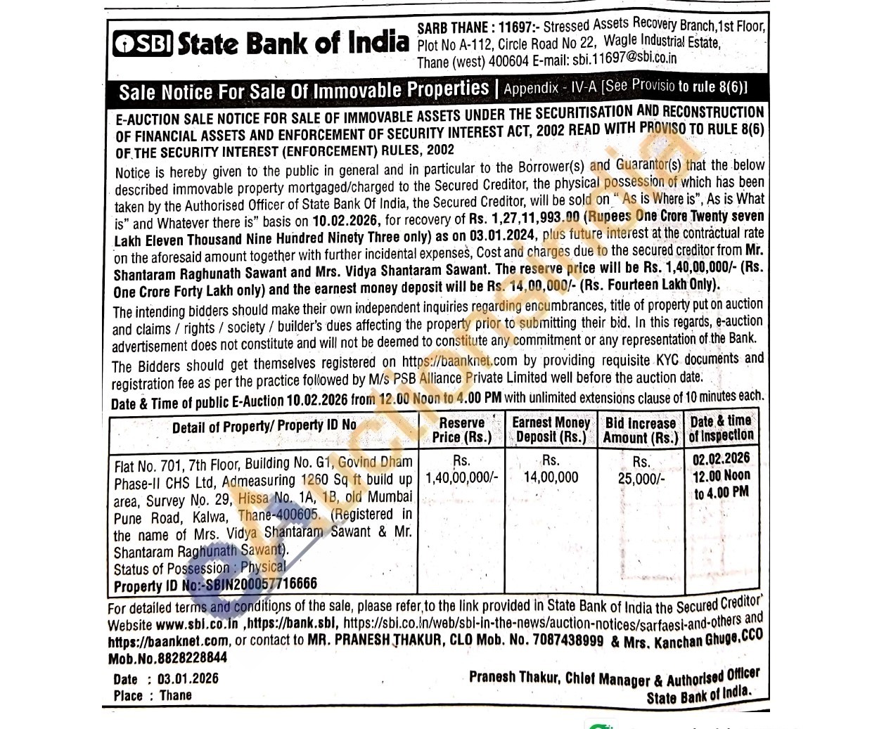 Flat No. 701, 7th Floor, Building No. G1, Govind Dham Phase-II CHS Ltd, Admeasuring 1260 Sq ft build up area, Survey No. 29, Hissa No. 1A, 1B, old Mumbai Pune Road, Kalwa, Thane-400605. (Registered in the name of Mrs. Vidya Shantaram Sawant & Mr. Shantaram Raghunath Sawant). Status of Possession: Physical Property ID No:-SBIN200057716666
