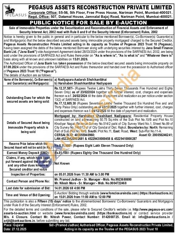 Mortgaged by: Harshaben Shashikant Nadiyapara: Residential Property House constructed on land admeasuring 50.75 Sq.mtrs of the Sub Plot No.10/B and Plot No.10 Khodiyar Nagar, Revenue Survey No.514/2 paiki of City Survey Ward No. 1, Sheet No.89 of City Survey No.1466/13 of of City Gondal of Dist. Rajkot. Boundaries by: North: Remaining Part of Sub Plot No. 10/B, South: Plot No. 11, East: Road, West: Sub-Plot No.11-A. CERSAI SI.ID: 400055940960