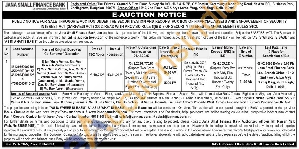 Details of Secured Assets: Built up Free Hold Property on Ground Floor, Land Area Measuring 99.44 Sq.mtrs., First and Second Floor with its exclusive Roof/ Terrace Rights upto Sky, Land Area Measuring 125.45 Sq.mtrs., (150 Sq.yds.), Built up free Hold Property bearing Municipal No.312, 313 and 314, situated at Main Bazar, G.T. Road, Subzi Mandi, Delhi-110007. Owned by Mrs. Nirmal Verma, W/o. Sh. V.P Verma & Mrs. Suman Verma, W/o. Mr. Vinay Verma & Ms. Sunita Verma, D/o. Sh. Sohan Lal Verma. Bounded as: East: Other's Property, West: Other's Property, North: Other's Property, South: Gali.