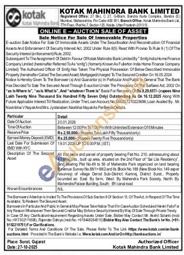 All that piece and parcel of property bearing Fiat No. 210, admeasuring about 41.68sqmits, built up area, situated on the 2nd Floor of "Sai Lila Residency, land bearing Plot No:49 to 56 of Mahendra Park organized on land bearing Revenue Survey No.88/1+88/2 and its Block No. 188 (New Block No. 149 asper resurvey) of village Derod. Sub-District: Kamrej District Surat, Property bounded as: East. By farm, West. By Mahendra Park Sodety, North: By Mahendra Palace Building South BY canal road