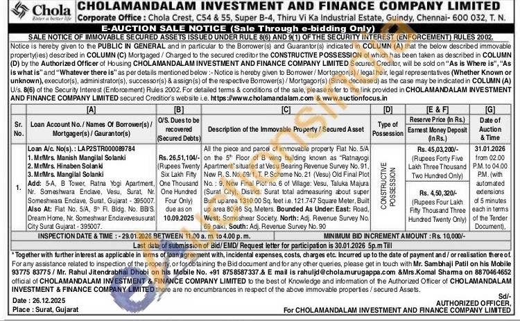 All the piece and parcel of immovable property Flat No. 5/A - on the 5th Floor of B wing building known as "Ratnayogi Apartment" situated at Vesu Bearing Revenue Survey No. 91, New R. S. No. 69/1, T. P. Scheme No. 21 (Vesu) Old Final Plot No. 9, New Final Plot no. 6 of Village: Vesu, Taluka Majura (Surat City), District: Surat total admeasuring about super Built uparea 1310.00 Sq. feet ie. 121.747 Square Meter, Built up area 80.46 Sq. Meters, Bounded As Under: East: Road, West: Someshwar Society, North: Adj. Revenue Survey No. 69 paki, South: Adj. Revenue Survey No.90