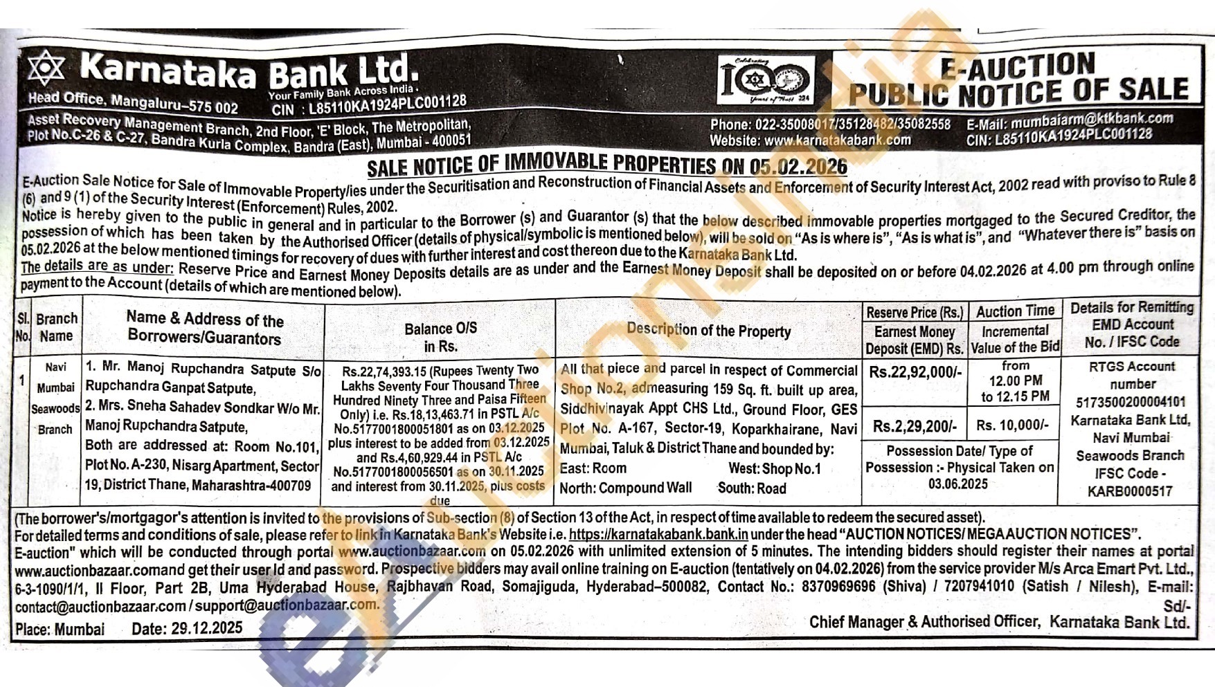 All that piece and parcel in respect of Commercial Shop No.2, admeasuring 159 Sq. ft. built up area, Siddhivinayak Appt CHS Ltd., Ground Floor, GES Plot No. A-167, Sector-19, Koparkhairane, Navi Mumbai, Taluk & District Thane and bounded by East: Room West: Shop No.1 North: Compound Wall South: Road