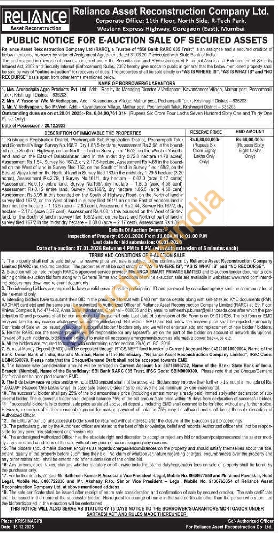 1. Krishnagiri Registration District, Pochampalli Sub Registration District, Pochampalli Taluk and Sonarhalli Village Survey No. 168/2. Dry 1.85.5-hectare, Assessment Rs.3.98 in the bound-ed on te South of Highway, on the North of land in Survey fled 167/2, on the West of Yasotha land and on the East of Balakrishnan land in the midst dry 0.72.0 hectare (1.78 acres), Assessment Rs 1.54, Survey No. 167/2, dry 2.17.5-hectare, Assessment Rs.4.68 in the bound-ed on the West of land in Survey filed 162, on the South of land in Survey filed 168/2, on the East of Vijaya land on the North of land in Survey filed 163 in the midst dry 1.29 5 hectare (3.20 acres). Assessment Rs.2.79, 1.Survey No.161/1, dry hectare0.07.0 (acre 0.17 cents), Assessment Rs.0.15 entire land. Survey No. 168/, dry hectare 1.85.5 (acre 4.58 cent), Assessment Rs.0.15 entire land, Survey No. 168/2, dry hectare 1.85.5 (acre 4.58 cent), Assessment Rs.3.98 in this bounded on the South of Highway Road, on the North of land in survey filled 167/2, on the West of land in survey filed 161/1 an on the East of vendors land in the midst dry hectare -1.13.5 (acre-2.80 cent), Assessment Rs.2.44, Survey No. 167/2, dry hectare-2.17.5 (acre 5.37 cent), Assessment Rs.4.68 in this bounded on the West of Sridevi land, on the South of land in survey filed 168/2 and, on the East, and North of part of land in survey filled 167/2 in the midst dry hectare -0.88.0 (acre-2.17 cent), Assessment Rs.1.89, -
