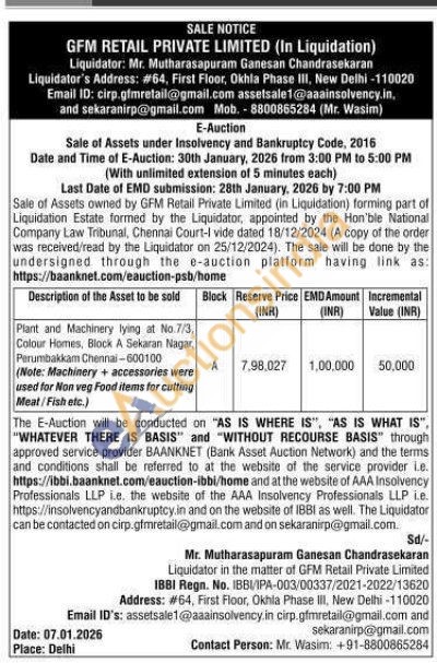 Plant and Machinery lying at No.7/3, Colour Homes, Block A Sekaran Nagar, Perumbakkam Chennai-600100