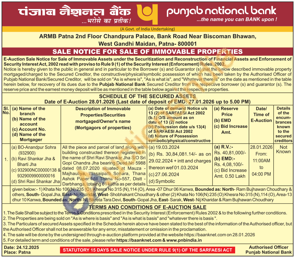 All the piece and parcel of land along with building constructed thereon registered in the name of Shri Ravi Shankar Jha S/O Sri Gopi Chandra Jha bearing Deed No 5988 dated 08.07.2020 situated at Mauza Majhauliya, Wasaipatti Sohara, Thana Ashok Paper Mill Thana No-557, Distt Darbhanga, totaling 01 katha as per detailsgiven below:- 1) Khata No 106(N) 235 (O), Khesra No 315 (N), 114 (O), Area-07 Dhur 06 Kanwa, Bounded as: North- Ram Bujhawan Choudhary & others, South-Gopal Jha, East-Nij Kharidar, West-Shobhakant Choudhary & other (2) Khata No 106(N) 235 (0) Khesra No 315 (N), 114 (O), Area-13 dhur 10 Kanwa, Bounded as: North-Nij Bikreta Tara Devi, South-Gopal Jha, East-Sarak, West-Nij Kharidar & Ram Bujhawan Choudhary