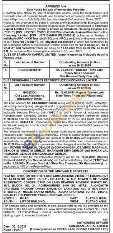 FLAT NO. B/805, ON THE 8TH FLOOR ADMEASURING 798 SQ. FT. EQUIVALENT TO 74.13.66 SQ. MTRS. (BUILT UP AREA), IN THE TOWER B OF "VIVEK RESIDENCY", CONSTRUCTED ON LAND BEARING REVENUE SURVEY NO. 18/1, BLOCK NO. 24, ADMEASURING 3440 SQ. MTRS.. ALONGWITH UNDIVIDED PROPORTIONATE SHARE OF LAND AND ALL OTHER RIGHT SITUATED AT MOUJE SANIYA HEMAD, TALUKA CHORYASI, SURAT-395010, GUJARAT.