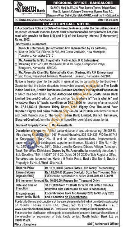All that part and parcel of land admeasuring 126.087 Sq. Mtrs bearing Khata Old No. 1947, Present Khata No. 5361324835, PID No. 91748 in Corporation Ward No. 5 and all other constructions, improvements, easementary rights existing and appurtenant thereon, Situated in Site No. 4, Sy. No. 28/3 (Later Sy No. 28/4), Dibbur Janatha Colony, Dibburu Village, Tumakuru Taluk, Tumakuru District and Owned by Mr. Amanathulla, more fully described in Sale Deed No. TMK-1-16017-2019-20, Dated 06-01-2020 of Sub Registrar Office-Tumakuru and bounded on, North: 9 Meter Road, East: Site No. 5, South: Property in Sy No. 5, West: Site No. 3.
